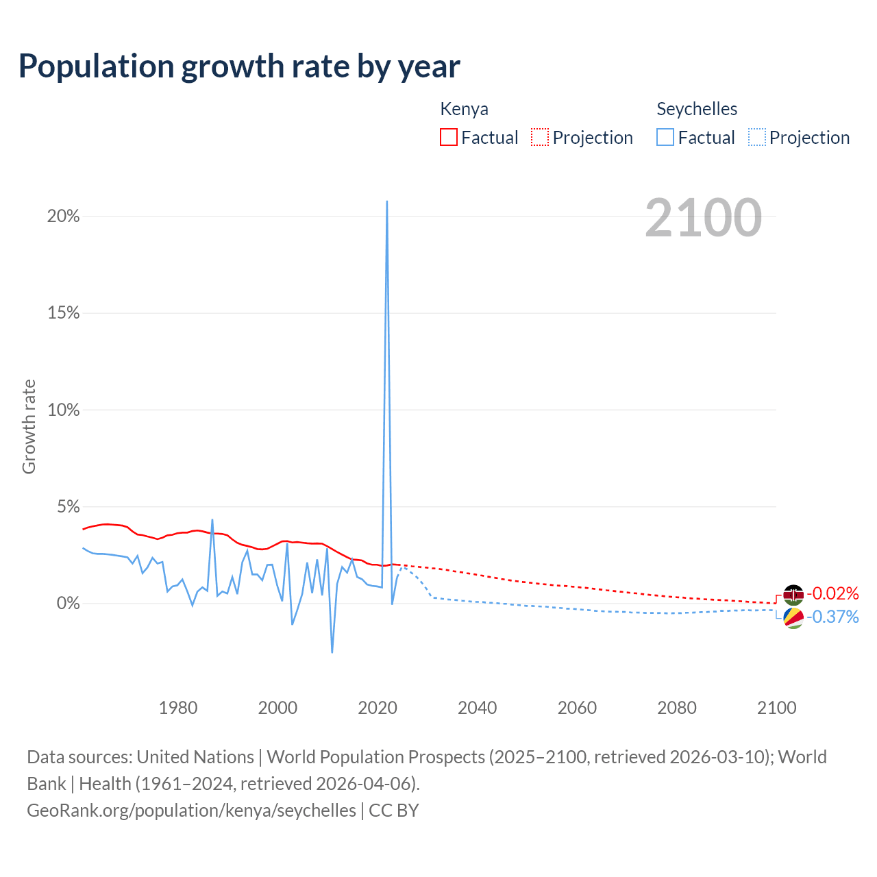 - For the last 10 years, Kenya has had an average growth rate of +2.08% per year vs +2.9% in the Seychelles.