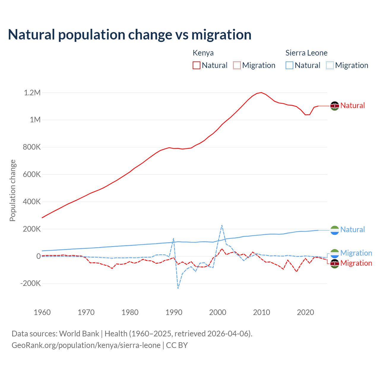 Over the last 10 years, 95.3% of the population change in Kenya is from natural causes (a gain of 10,892,362 people) and 4.67% is from migration (a loss of 533,876 people). In Sierra Leone 99.6% is from natural causes (a gain of 1,764,049 people) and 0.41% is from migration (a loss of 7,211 people).