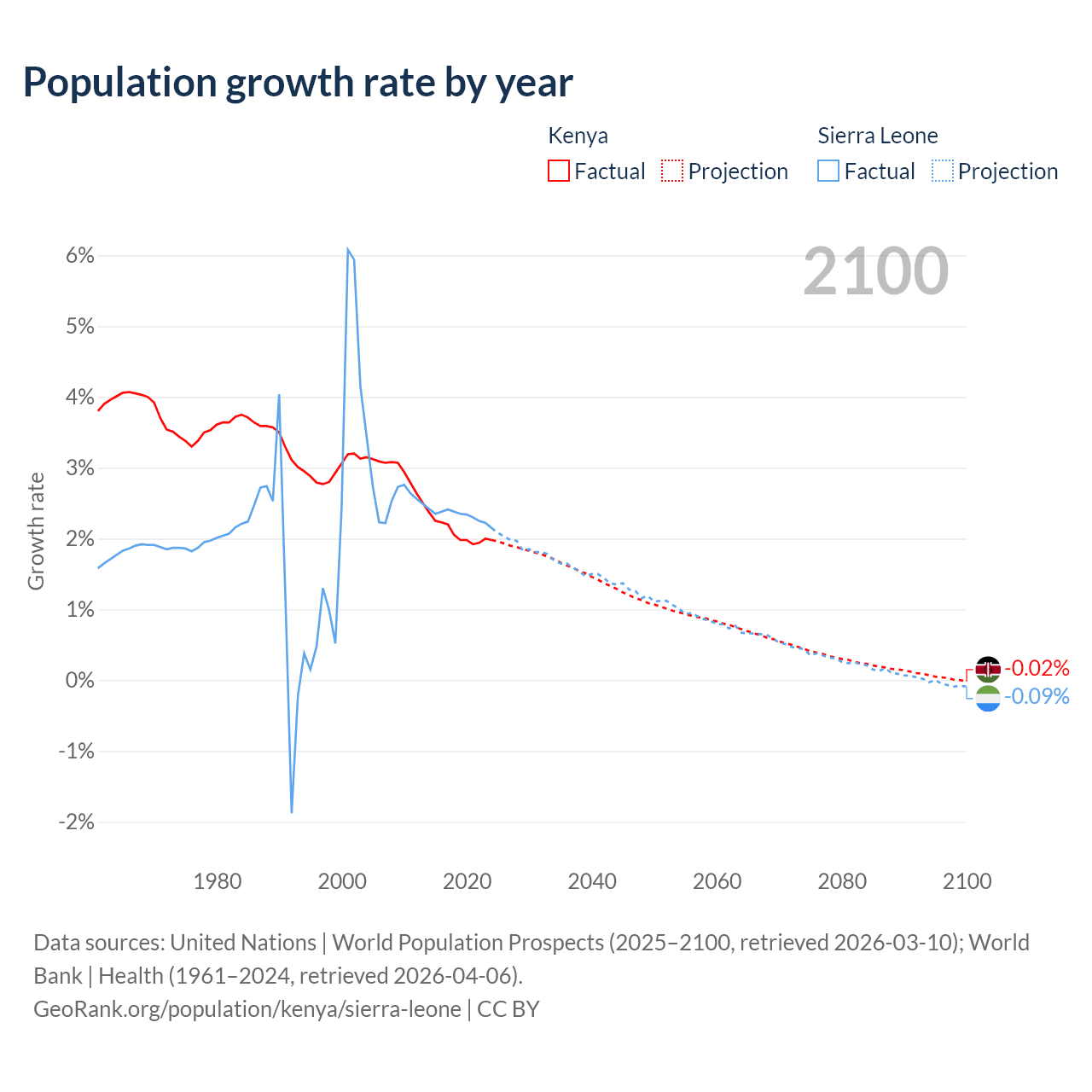- For the last 10 years, Kenya has had an average growth rate of +2.08% per year vs +2.32% in Sierra Leone.