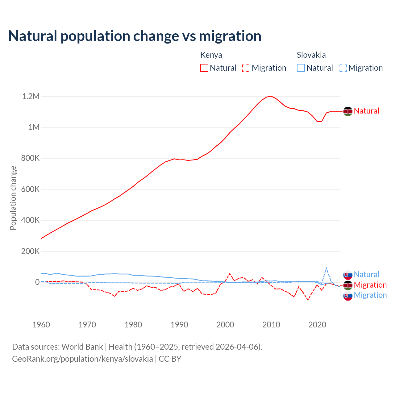 Over the last 10 years, 95.3% of the population change in Kenya is from natural causes (a gain of 10,892,362 people) and 4.67% is from migration (a loss of 533,876 people). In Slovakia 7.47% is from natural causes (a loss of 8,728 people) and 92.5% is from migration (a gain of 108,156 people).