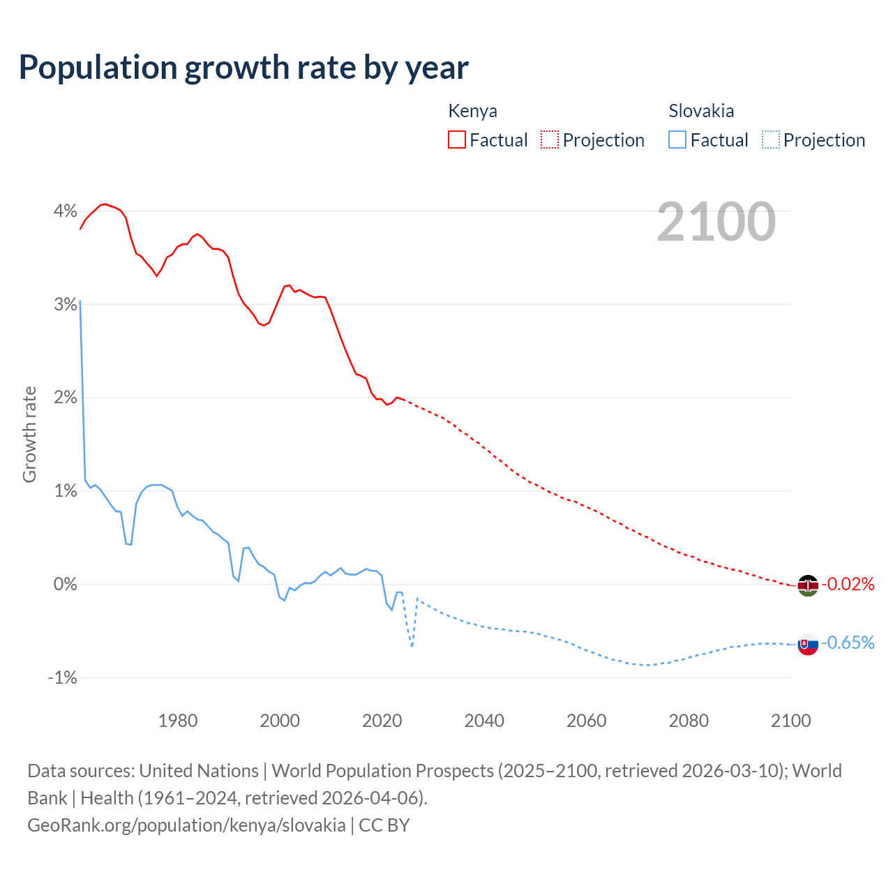 - For the last 10 years, Kenya has had an average growth rate of +2.08% per year vs +0.01% in Slovakia.