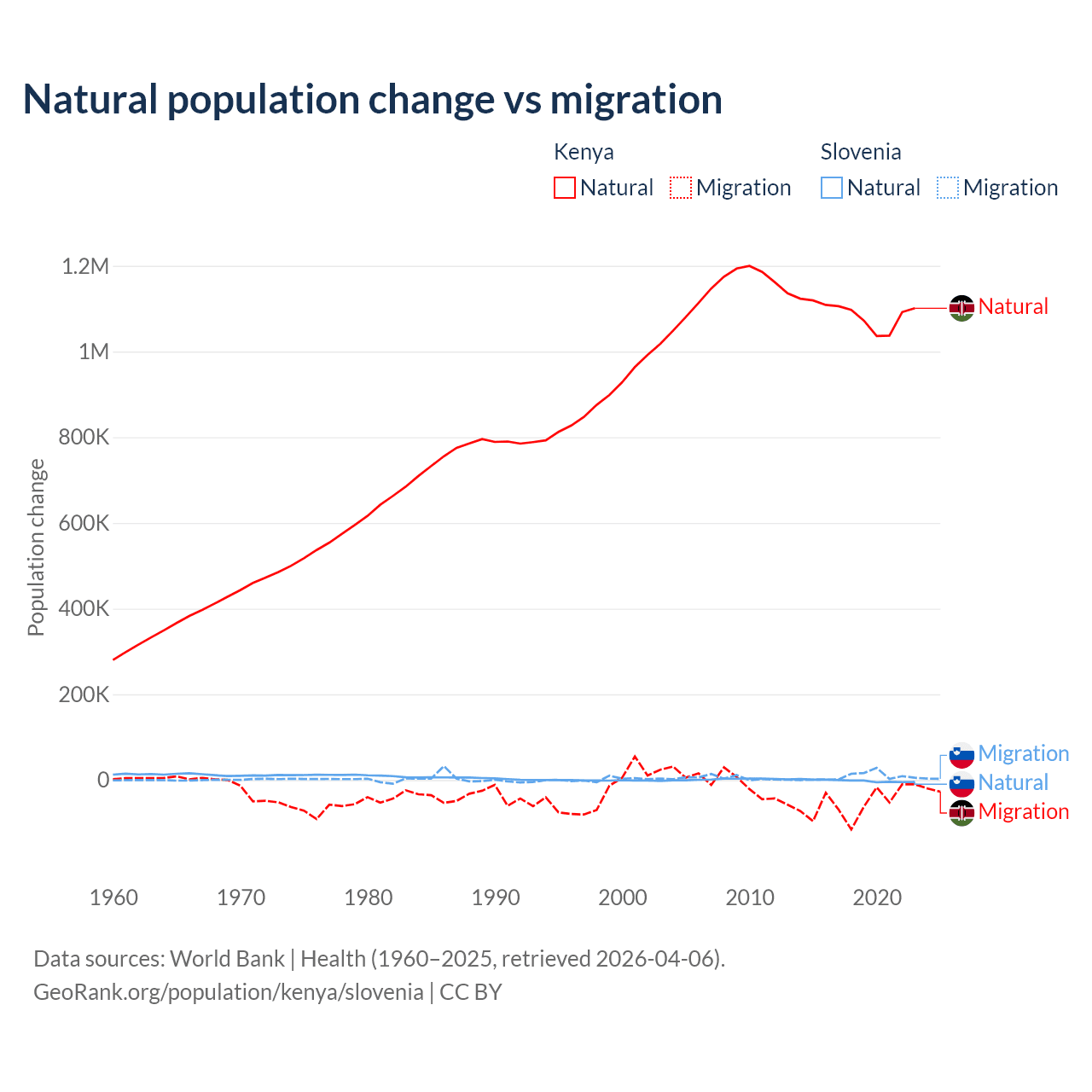 Over the last 10 years, 95.3% of the population change in Kenya is from natural causes (a gain of 10,892,362 people) and 4.67% is from migration (a loss of 533,876 people). In Slovenia 18.1% is from natural causes (a loss of 17,573 people) and 81.9% is from migration (a gain of 79,532 people).