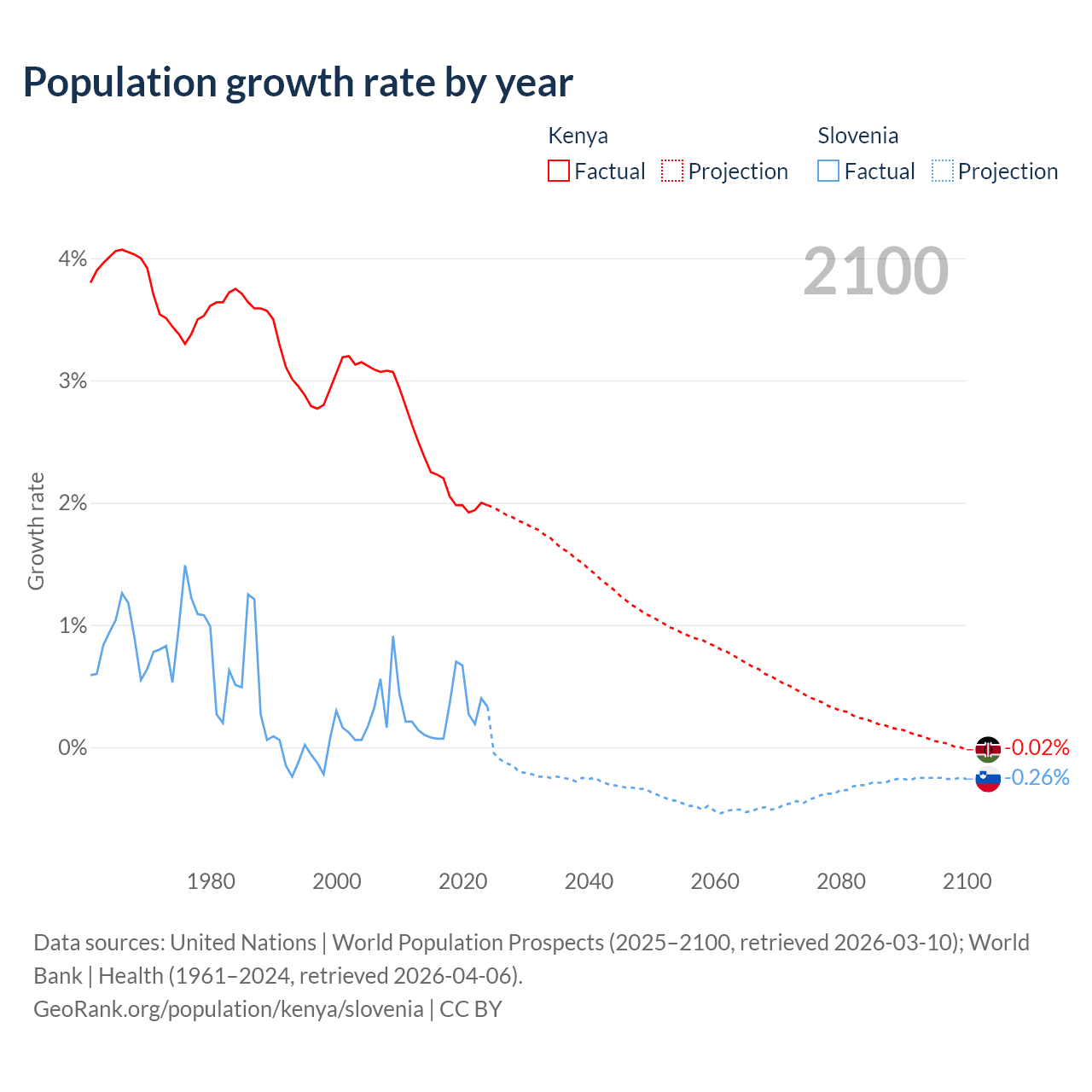 - For the last 10 years, Kenya has had an average growth rate of +2.08% per year vs +0.29% in Slovenia.