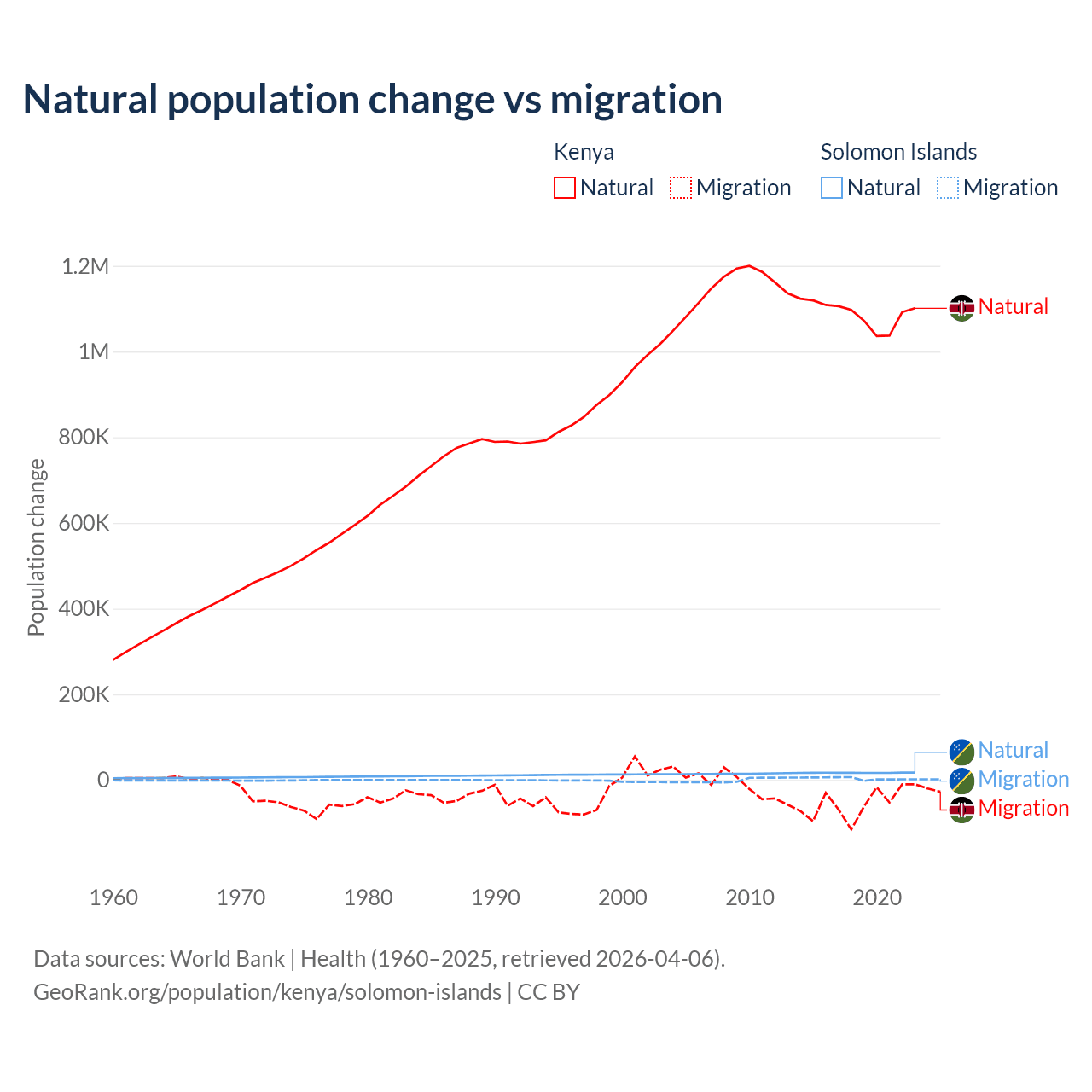 Over the last 10 years, 95.3% of the population change in Kenya is from natural causes (a gain of 10,892,362 people) and 4.67% is from migration (a loss of 533,876 people). In the Solomon Islands 82.8% is from natural causes (a gain of 168,727 people) and 17.2% is from migration (a gain of 35,031 people).