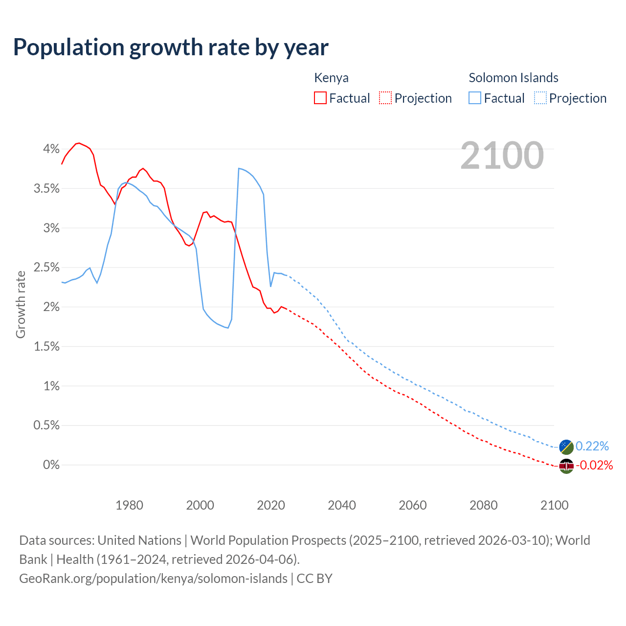 - For the last 10 years, Kenya has had an average growth rate of +2.08% per year vs +2.95% in the Solomon Islands.