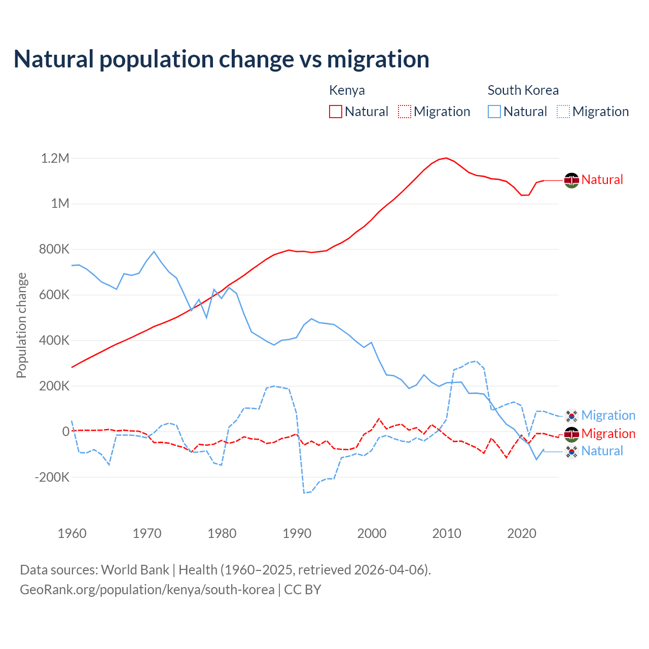 Over the last 10 years, 95.3% of the population change in Kenya is from natural causes (a gain of 10,892,362 people) and 4.67% is from migration (a loss of 533,876 people). In South Korea 17.6% is from natural causes (a gain of 277,215 people) and 82.4% is from migration (a gain of 1,298,356 people).