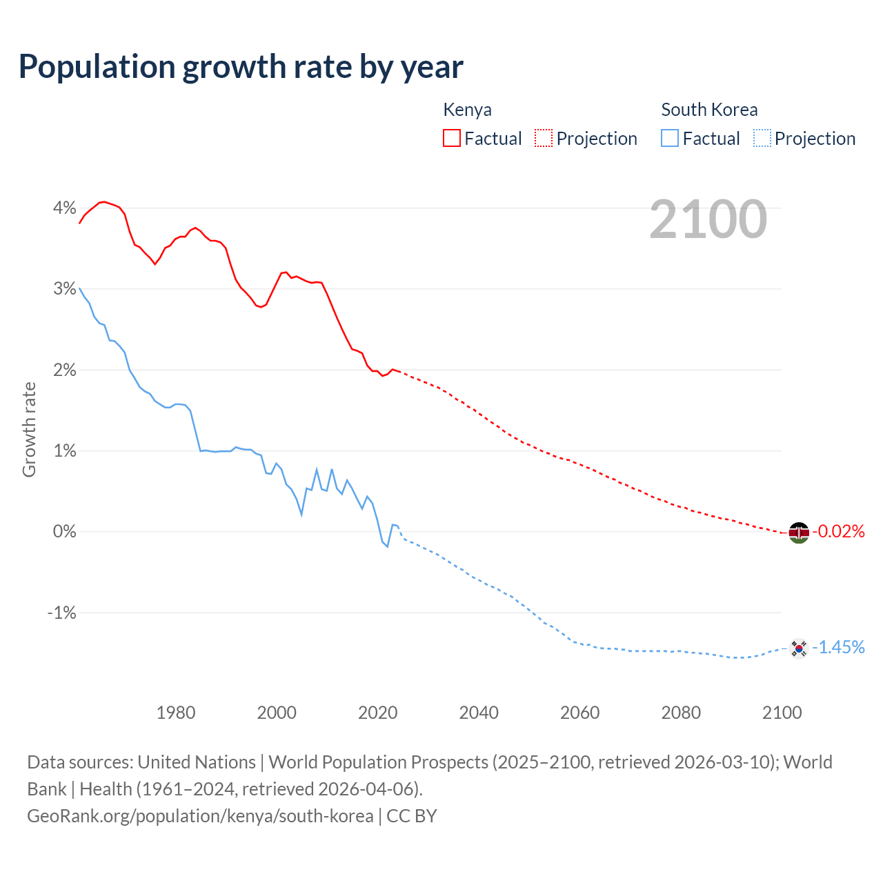 - For the last 10 years, Kenya has had an average growth rate of +2.08% per year vs +0.24% in South Korea.