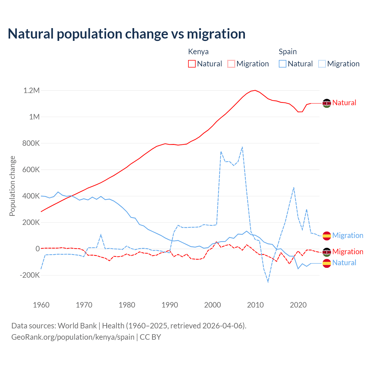 Over the last 10 years, 95.3% of the population change in Kenya is from natural causes (a gain of 10,892,362 people) and 4.67% is from migration (a loss of 533,876 people). In Spain 25.8% is from natural causes (a loss of 627,829 people) and 74.2% is from migration (a gain of 1,810,127 people).