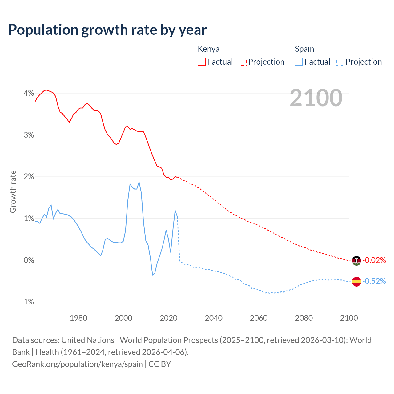 - For the last 10 years, Kenya has had an average growth rate of +2.08% per year vs +0.43% in Spain.