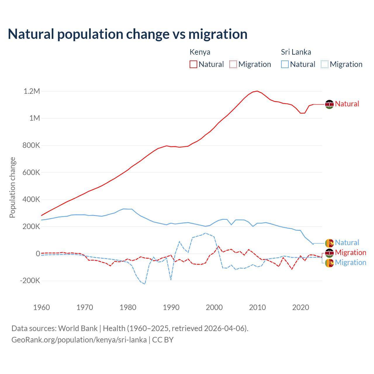 Over the last 10 years, 95.3% of the population change in Kenya is from natural causes (a gain of 10,892,362 people) and 4.67% is from migration (a loss of 533,876 people). In Sri Lanka 85.3% is from natural causes (a gain of 1,605,749 people) and 14.7% is from migration (a loss of 276,121 people).