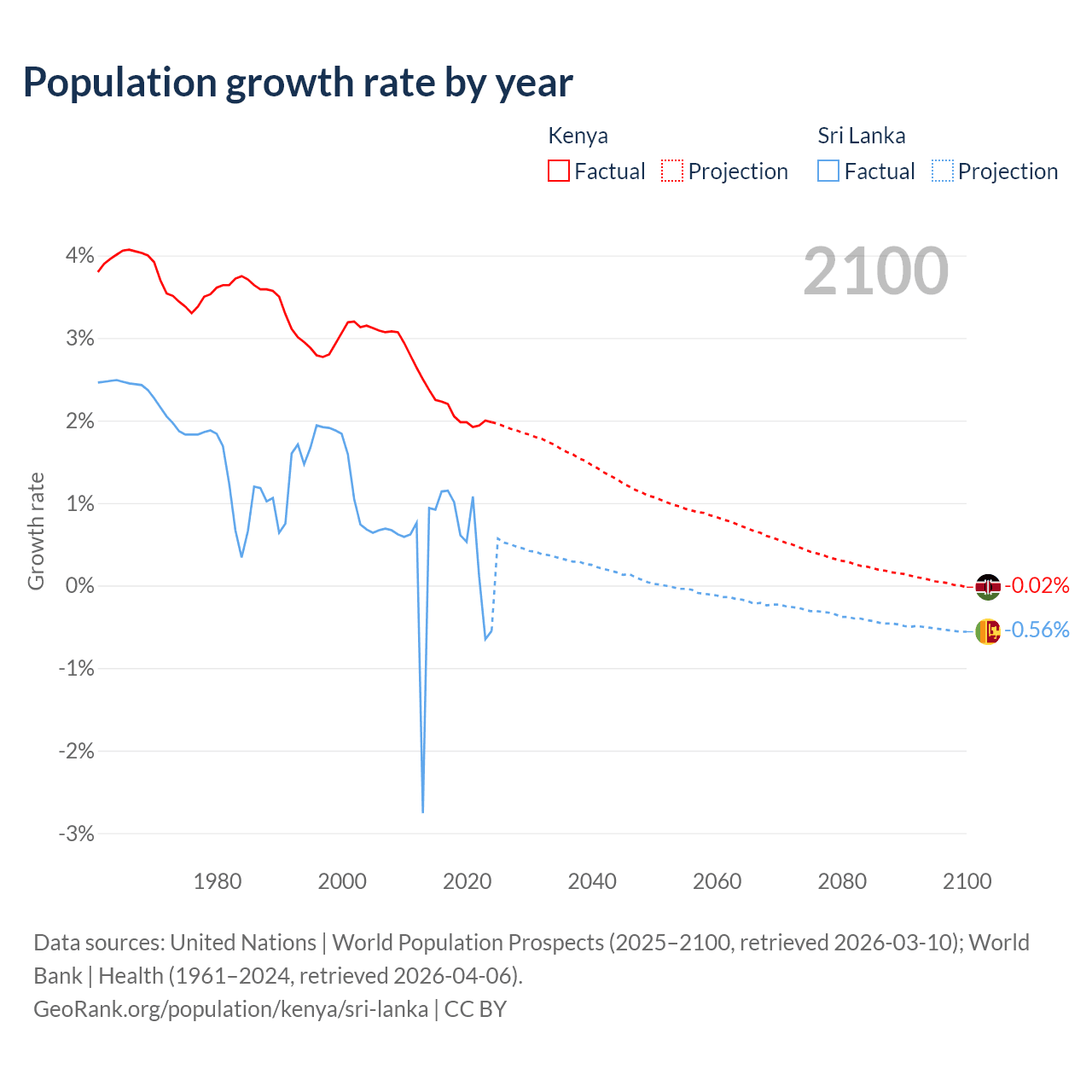 - For the last 10 years, Kenya has had an average growth rate of +2.08% per year vs +0.57% in Sri Lanka.