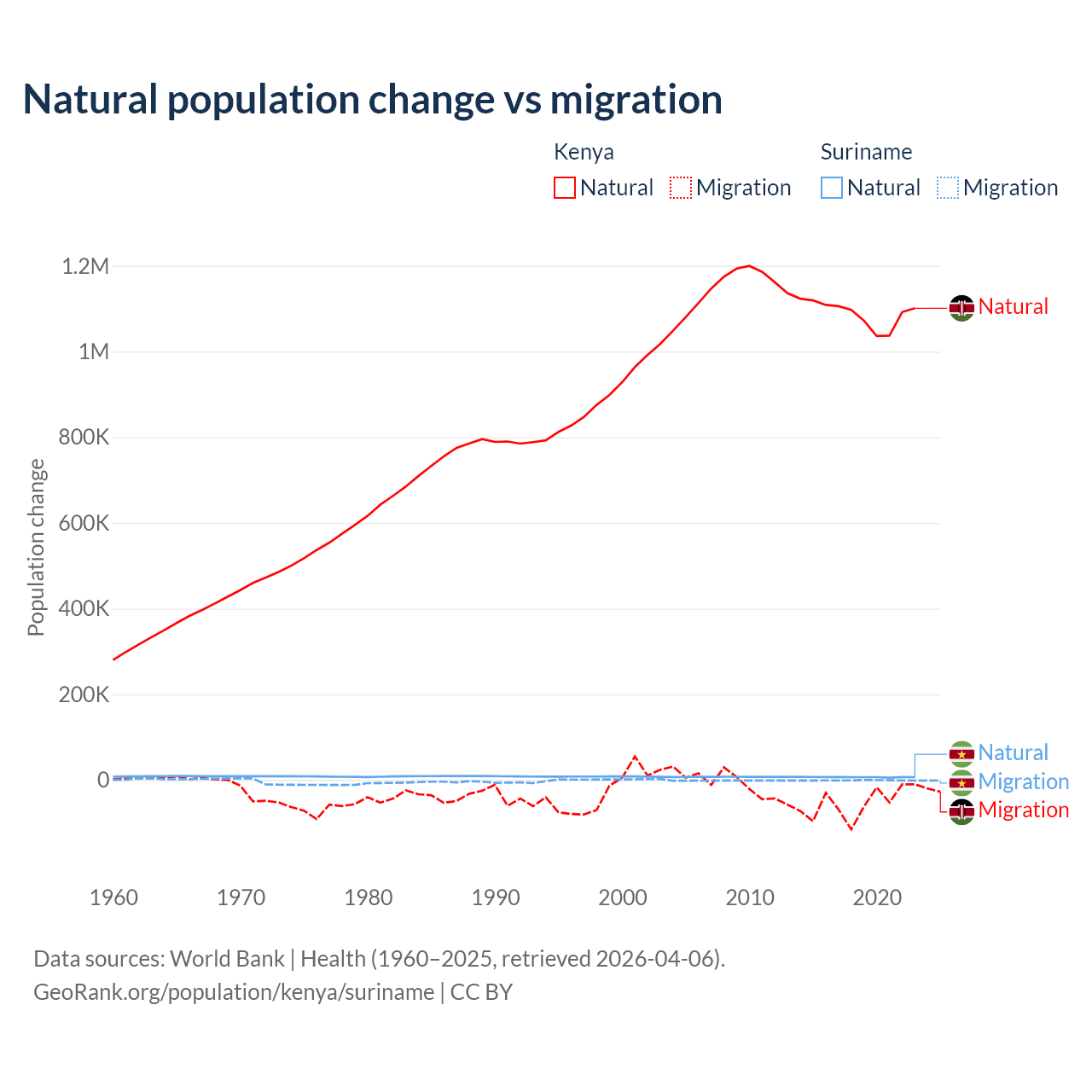 Over the last 10 years, 95.3% of the population change in Kenya is from natural causes (a gain of 10,892,362 people) and 4.67% is from migration (a loss of 533,876 people). In Suriname 90.3% is from natural causes (a gain of 66,709 people) and 9.72% is from migration (a loss of 7,185 people).