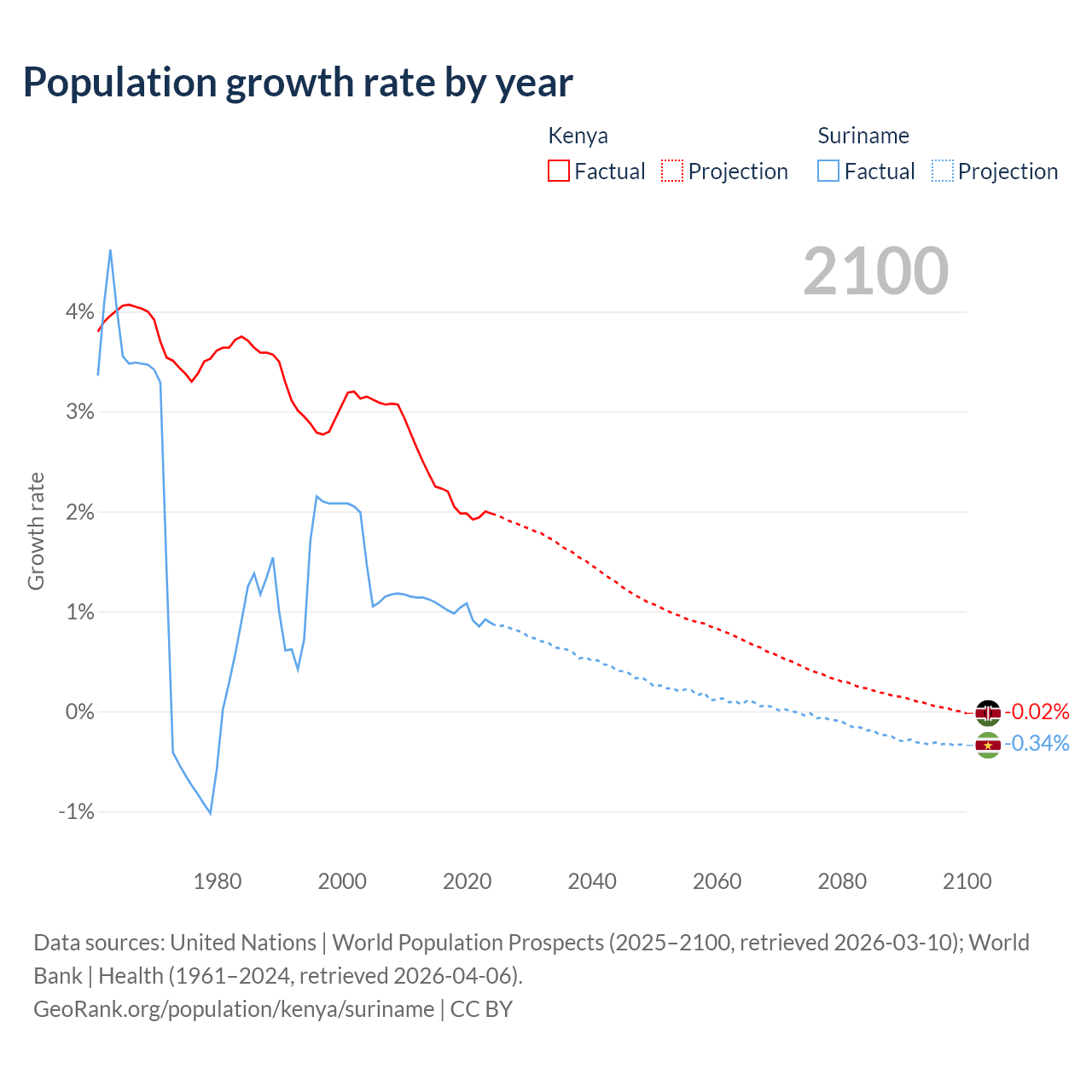 - For the last 10 years, Kenya has had an average growth rate of +2.08% per year vs +0.99% in Suriname.