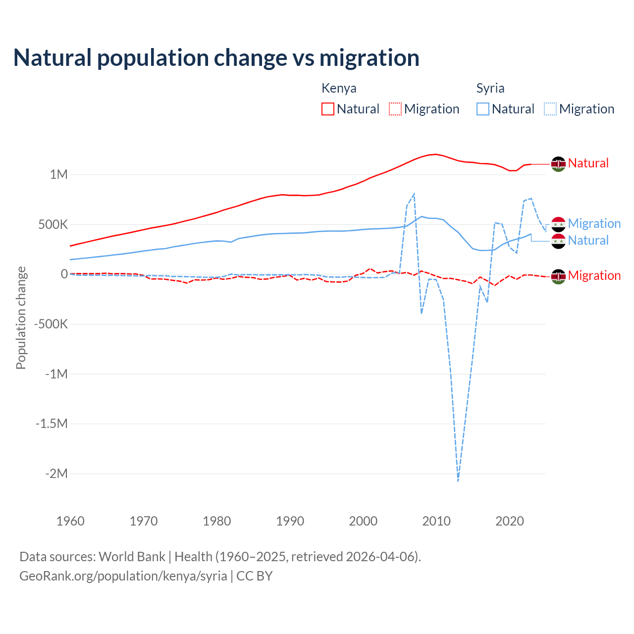 Over the last 10 years, 95.3% of the population change in Kenya is from natural causes (a gain of 10,892,362 people) and 4.67% is from migration (a loss of 533,876 people). In Syria 91.3% is from natural causes (a gain of 3,047,621 people) and 8.72% is from migration (a gain of 291,069 people).