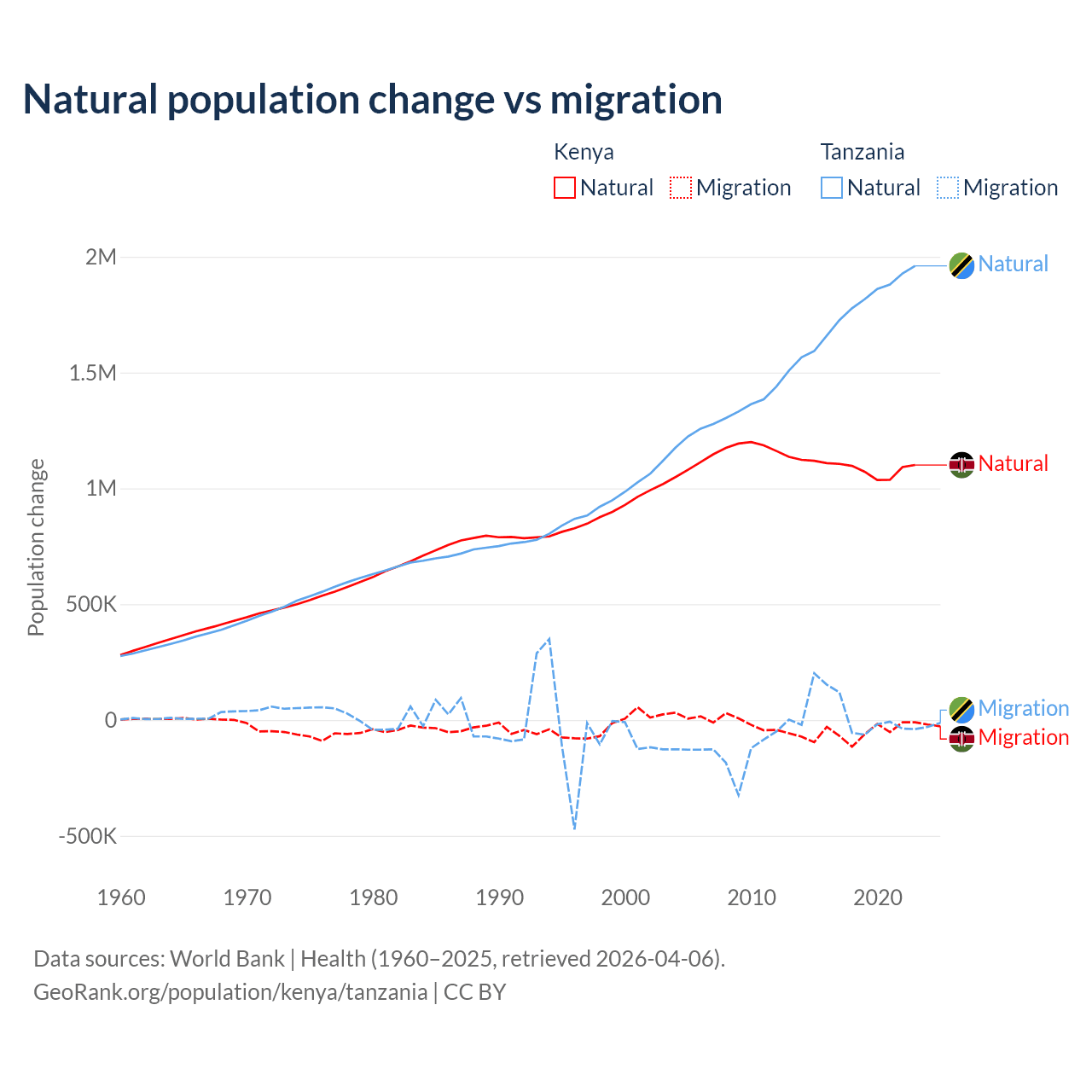 Over the last 10 years, 95.3% of the population change in Kenya is from natural causes (a gain of 10,892,362 people) and 4.67% is from migration (a loss of 533,876 people). In Tanzania 98.7% is from natural causes (a gain of 17,769,541 people) and 1.27% is from migration (a gain of 229,466 people).