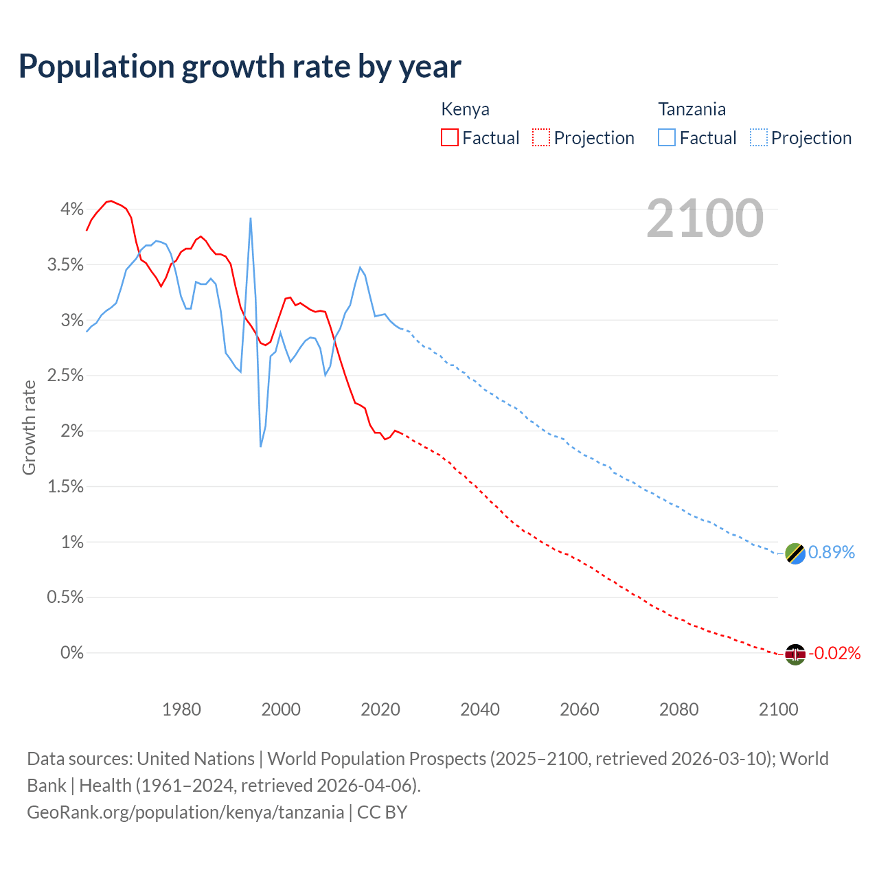 - For the last 10 years, Kenya has had an average growth rate of +2.08% per year vs +3.13% in Tanzania.