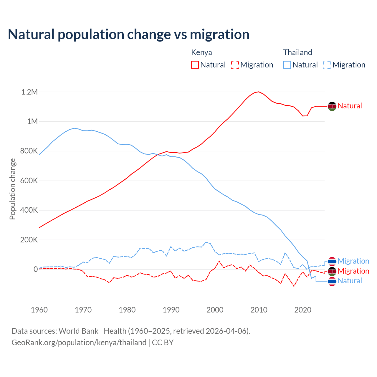 Over the last 10 years, 95.3% of the population change in Kenya is from natural causes (a gain of 10,892,362 people) and 4.67% is from migration (a loss of 533,876 people). In Thailand 78.4% is from natural causes (a gain of 1,292,528 people) and 21.6% is from migration (a gain of 355,361 people).