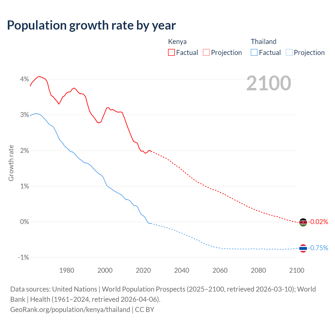 - For the last 10 years, Kenya has had an average growth rate of +2.08% per year vs +0.23% in Thailand.