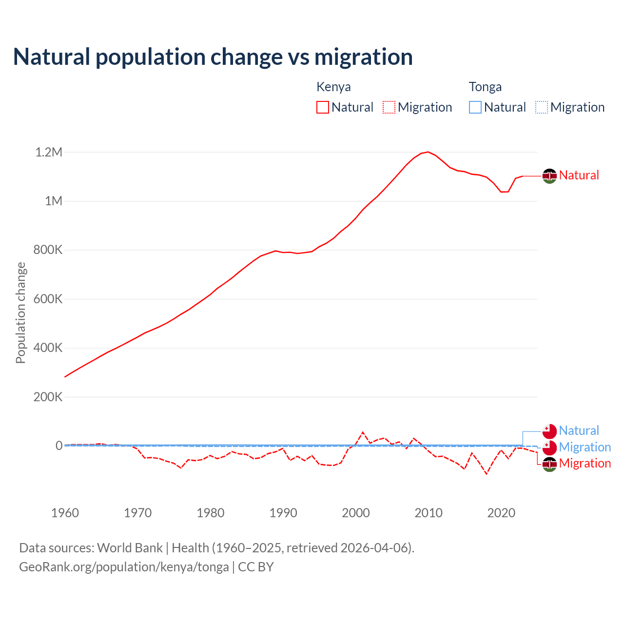 Over the last 10 years, 95.3% of the population change in Kenya is from natural causes (a gain of 10,892,362 people) and 4.67% is from migration (a loss of 533,876 people). In Tonga 46.9% is from natural causes (a gain of 18,919 people) and 53.1% is from migration (a loss of 21,384 people).