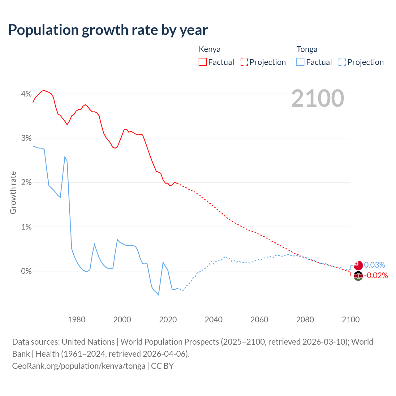 - For the last 10 years, Kenya has had an average growth rate of +2.08% per year vs -0.25% in Tonga.