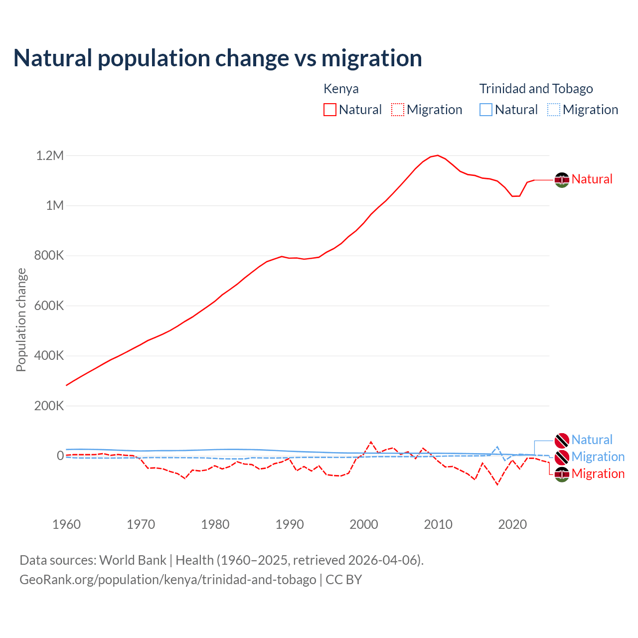Over the last 10 years, 95.3% of the population change in Kenya is from natural causes (a gain of 10,892,362 people) and 4.67% is from migration (a loss of 533,876 people). In Trinidad and Tobago 66% is from natural causes (a gain of 55,887 people) and 34% is from migration (a gain of 28,785 people).