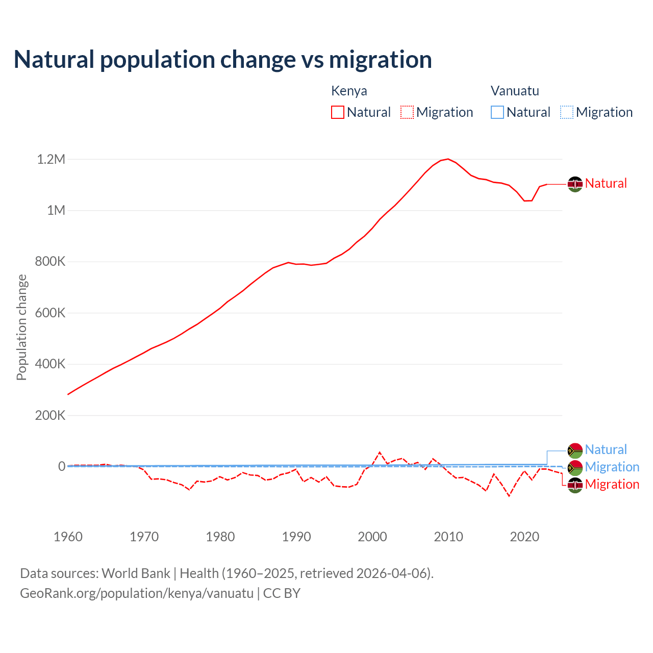 Over the last 10 years, 95.3% of the population change in Kenya is from natural causes (a gain of 10,892,362 people) and 4.67% is from migration (a loss of 533,876 people). In Vanuatu 92.2% is from natural causes (a gain of 72,941 people) and 7.81% is from migration (a loss of 6,181 people).