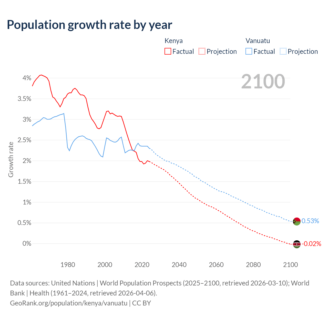 - For the last 10 years, Kenya has had an average growth rate of +2.08% per year vs +2.33% in Vanuatu.