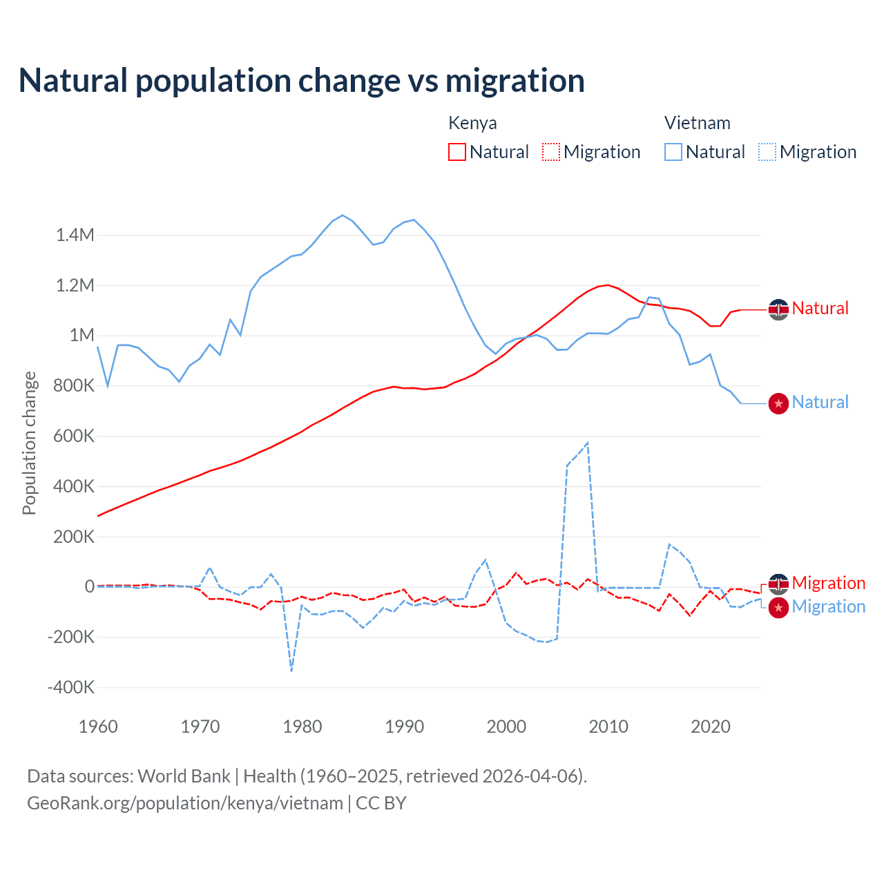 Over the last 10 years, 95.3% of the population change in Kenya is from natural causes (a gain of 10,892,362 people) and 4.67% is from migration (a loss of 533,876 people). In Vietnam 97.7% is from natural causes (a gain of 9,349,756 people) and 2.29% is from migration (a gain of 219,073 people).