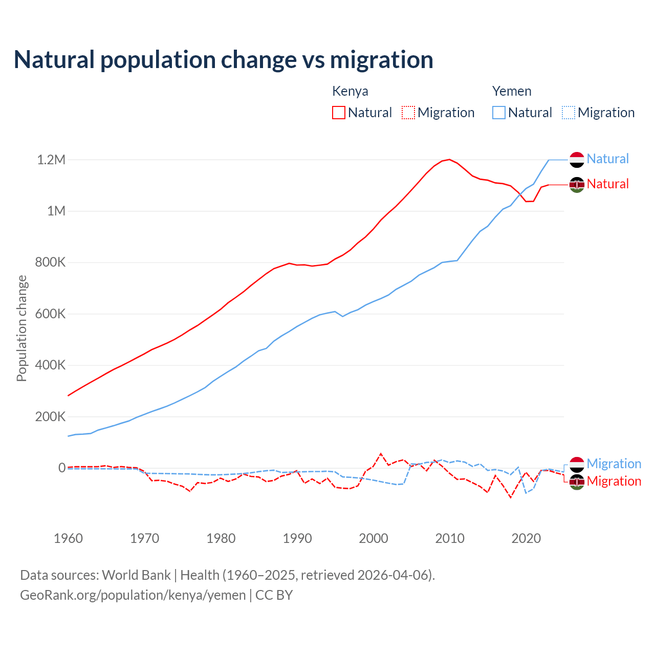 Over the last 10 years, 95.3% of the population change in Kenya is from natural causes (a gain of 10,892,362 people) and 4.67% is from migration (a loss of 533,876 people). In Yemen 97.8% is from natural causes (a gain of 10,460,813 people) and 2.17% is from migration (a loss of 231,814 people).