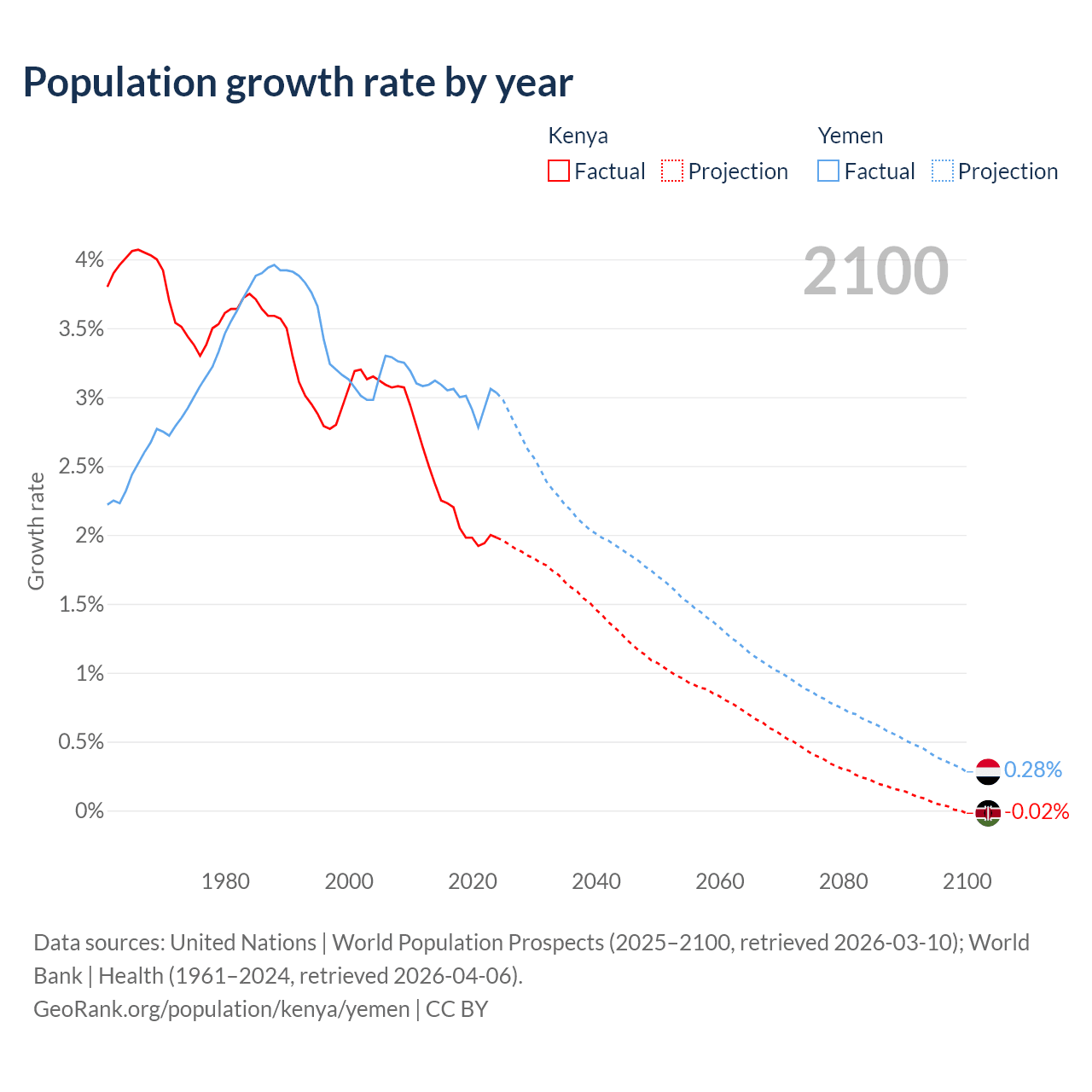 - For the last 10 years, Kenya has had an average growth rate of +2.08% per year vs +3% in Yemen.