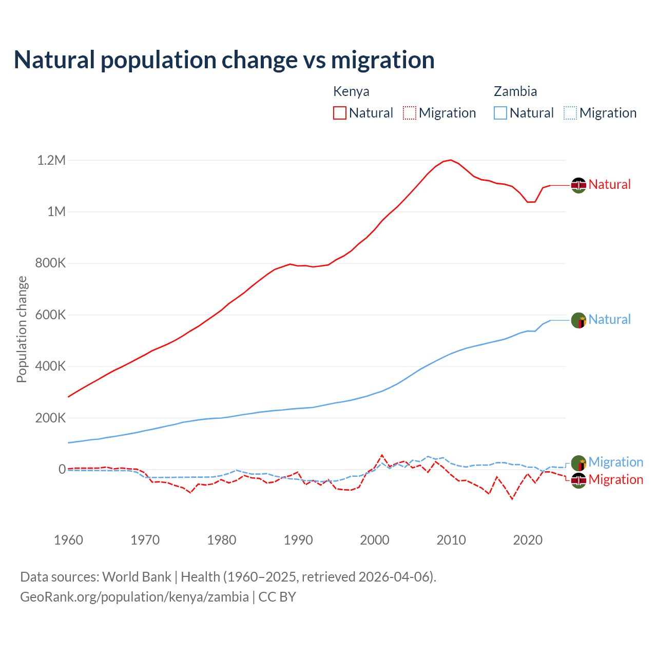 Over the last 10 years, 95.3% of the population change in Kenya is from natural causes (a gain of 10,892,362 people) and 4.67% is from migration (a loss of 533,876 people). In Zambia 97.4% is from natural causes (a gain of 5,233,797 people) and 2.58% is from migration (a gain of 138,554 people).