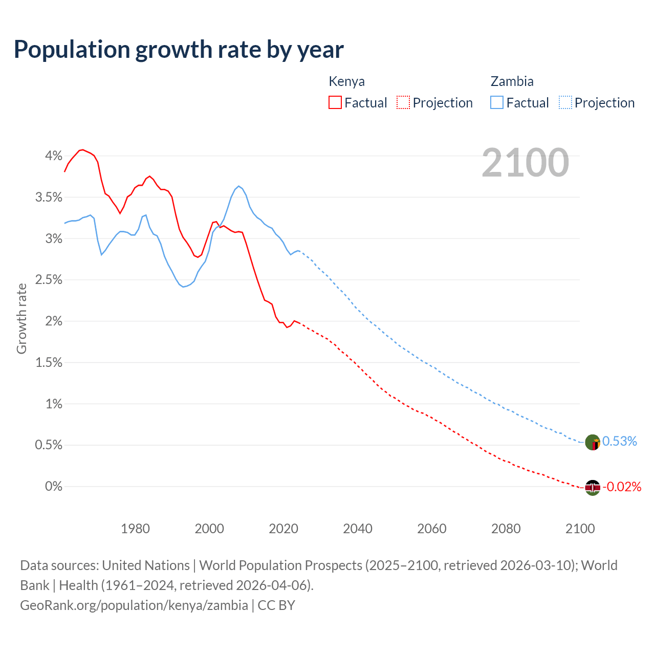 - For the last 10 years, Kenya has had an average growth rate of +2.08% per year vs +3% in Zambia.
