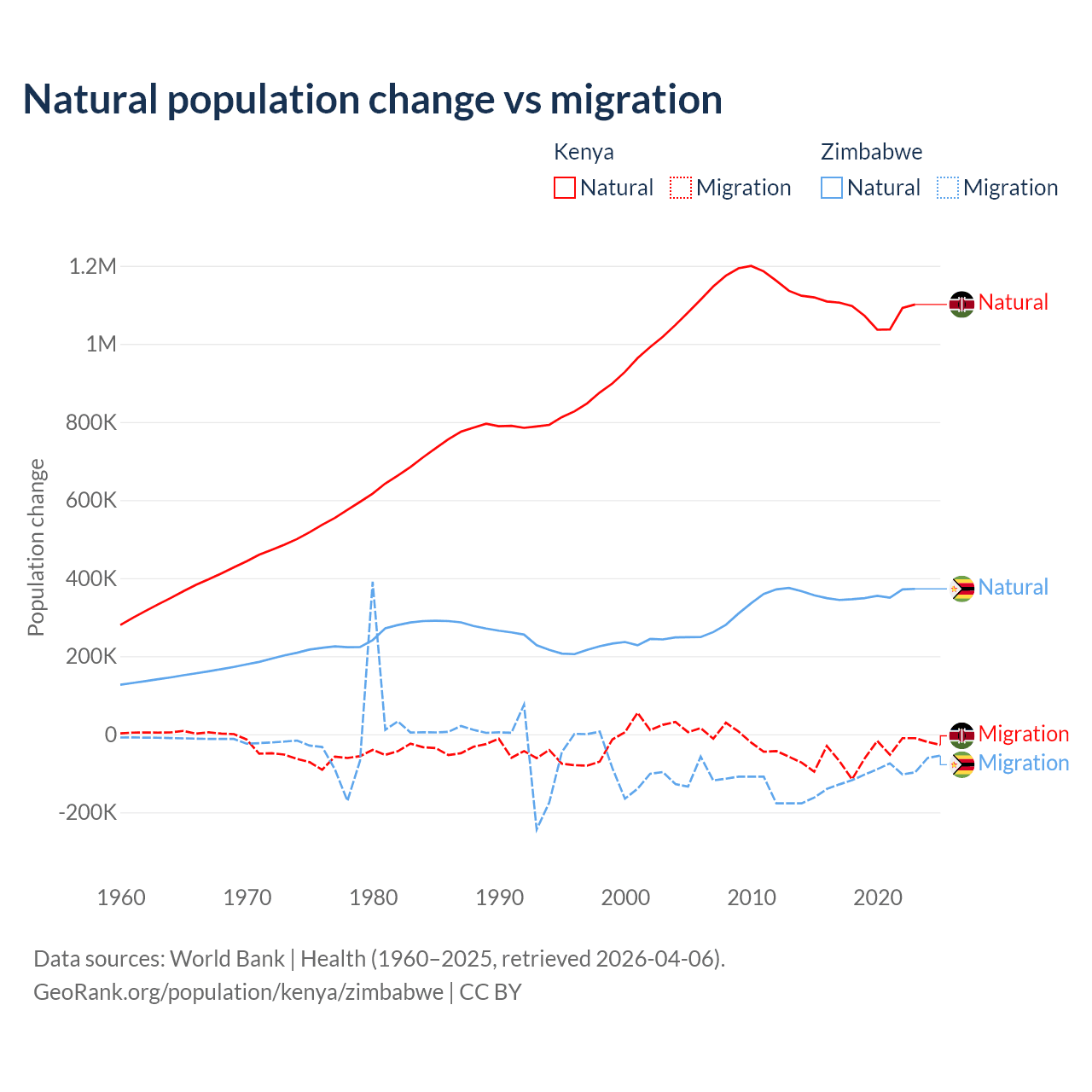 Over the last 10 years, 95.3% of the population change in Kenya is from natural causes (a gain of 10,892,362 people) and 4.67% is from migration (a loss of 533,876 people). In Zimbabwe 74.9% is from natural causes (a gain of 3,558,487 people) and 25.1% is from migration (a loss of 1,192,807 people).