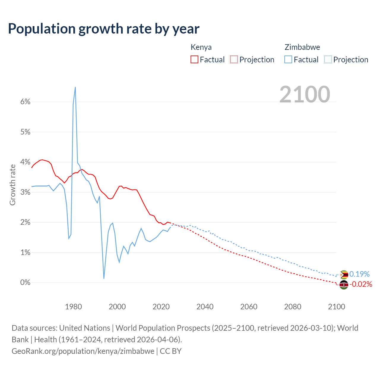 - For the last 10 years, Kenya has had an average growth rate of +2.08% per year vs +1.57% in Zimbabwe.