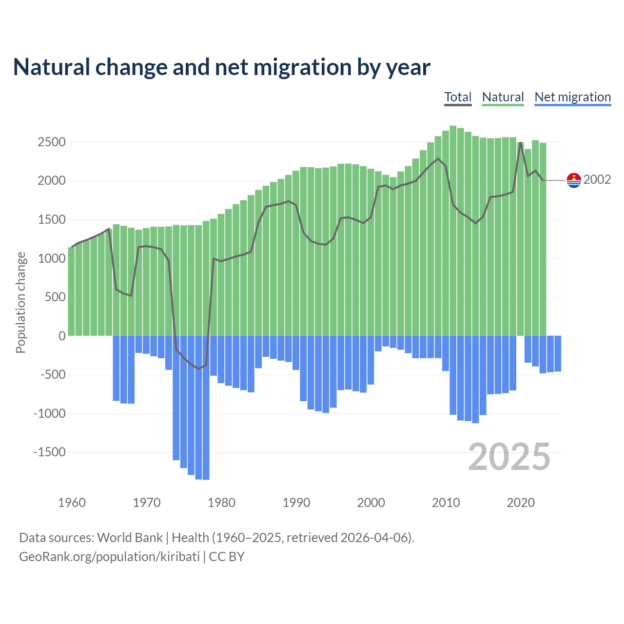 Over the last 10 years, 80% of the population change in Kiribati is from natural causes (a gain of 25,262 people) and 20% is from migration (a loss of 6,330 people).