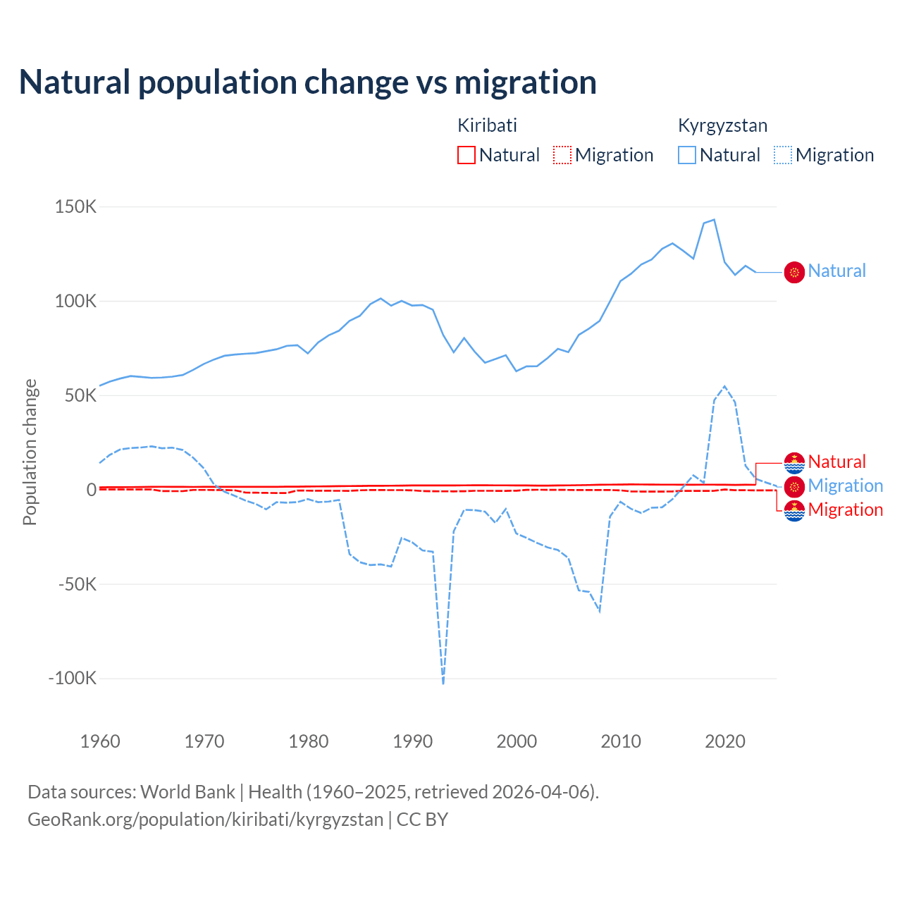 Over the last 10 years, 80% of the population change in Kiribati is from natural causes (a gain of 25,262 people) and 20% is from migration (a loss of 6,330 people). In Kyrgyzstan 88.5% is from natural causes (a gain of 1,258,837 people) and 11.5% is from migration (a gain of 164,132 people).