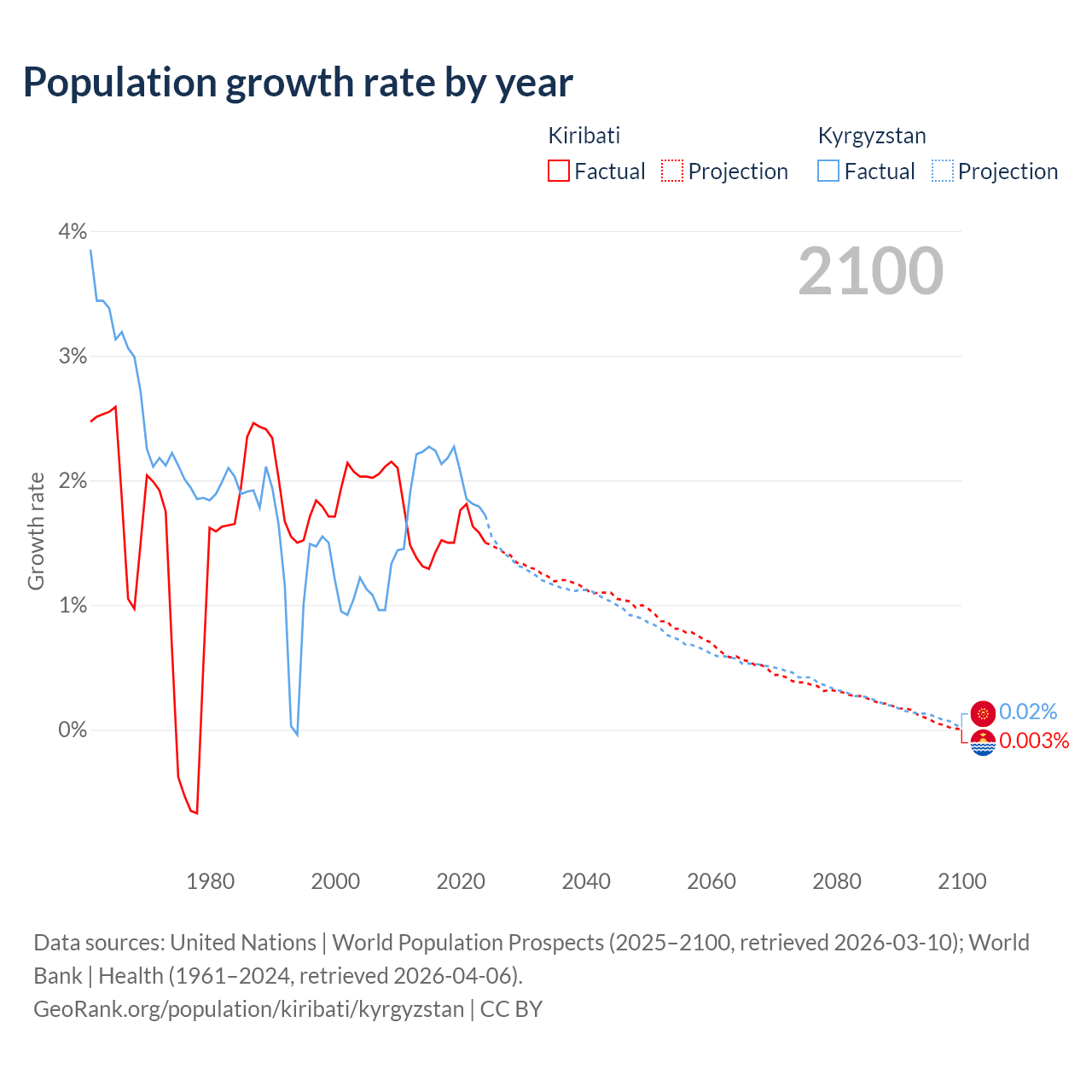 - For the last 10 years, Kiribati has had an average growth rate of +1.53% per year vs +2.05% in Kyrgyzstan.
