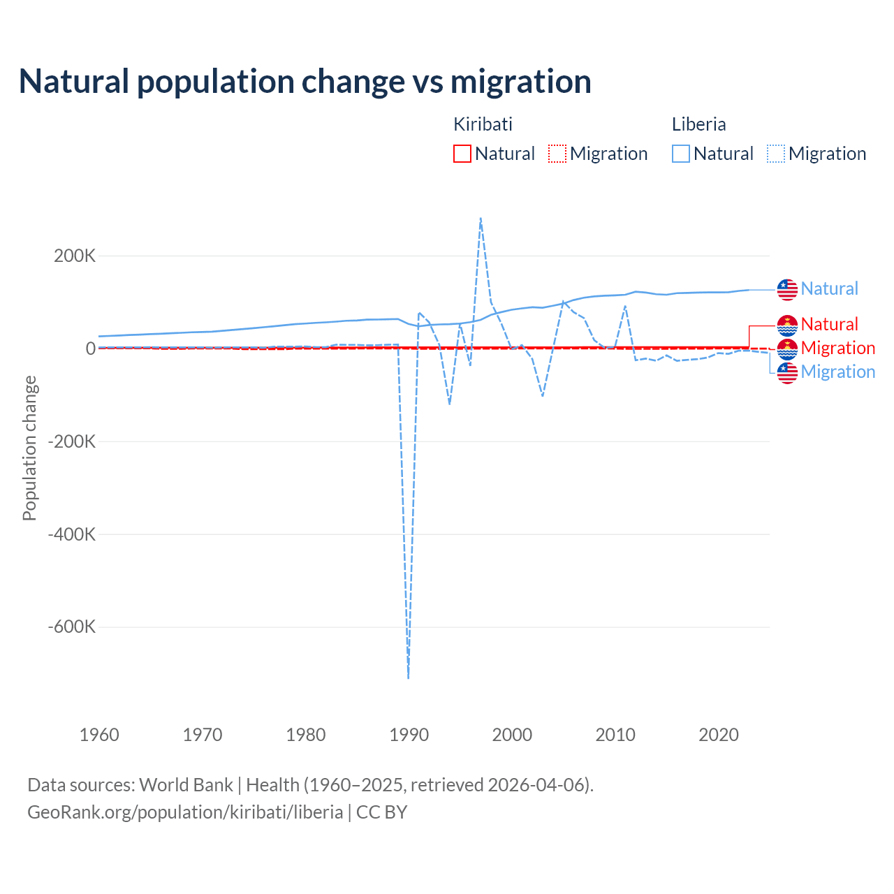 Over the last 10 years, 80% of the population change in Kiribati is from natural causes (a gain of 25,262 people) and 20% is from migration (a loss of 6,330 people). In Liberia 87.7% is from natural causes (a gain of 1,202,387 people) and 12.3% is from migration (a loss of 168,316 people).