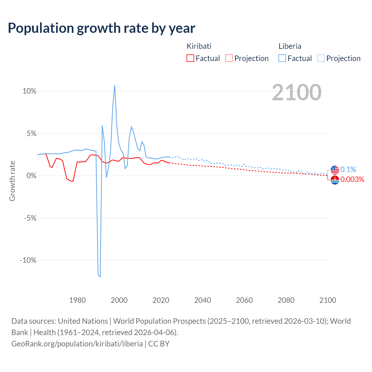 - For the last 10 years, Kiribati has had an average growth rate of +1.53% per year vs +2.09% in Liberia.