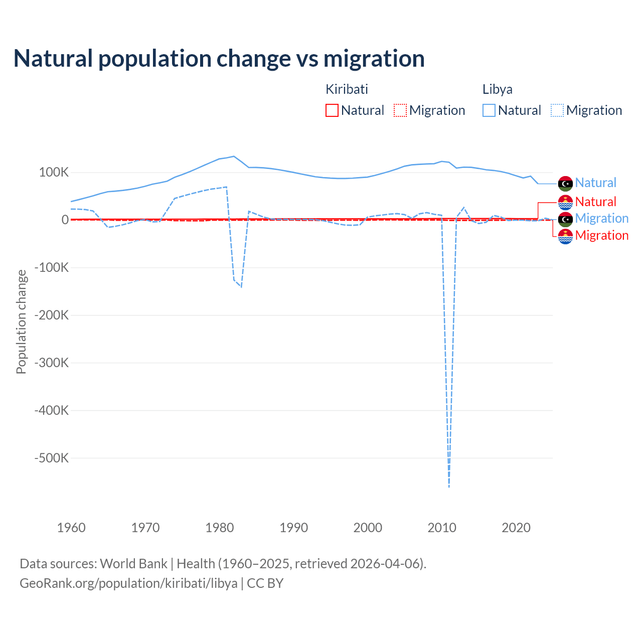 Over the last 10 years, 80% of the population change in Kiribati is from natural causes (a gain of 25,262 people) and 20% is from migration (a loss of 6,330 people). In Libya 99.4% is from natural causes (a gain of 975,799 people) and 0.63% is from migration (a loss of 6,150 people).