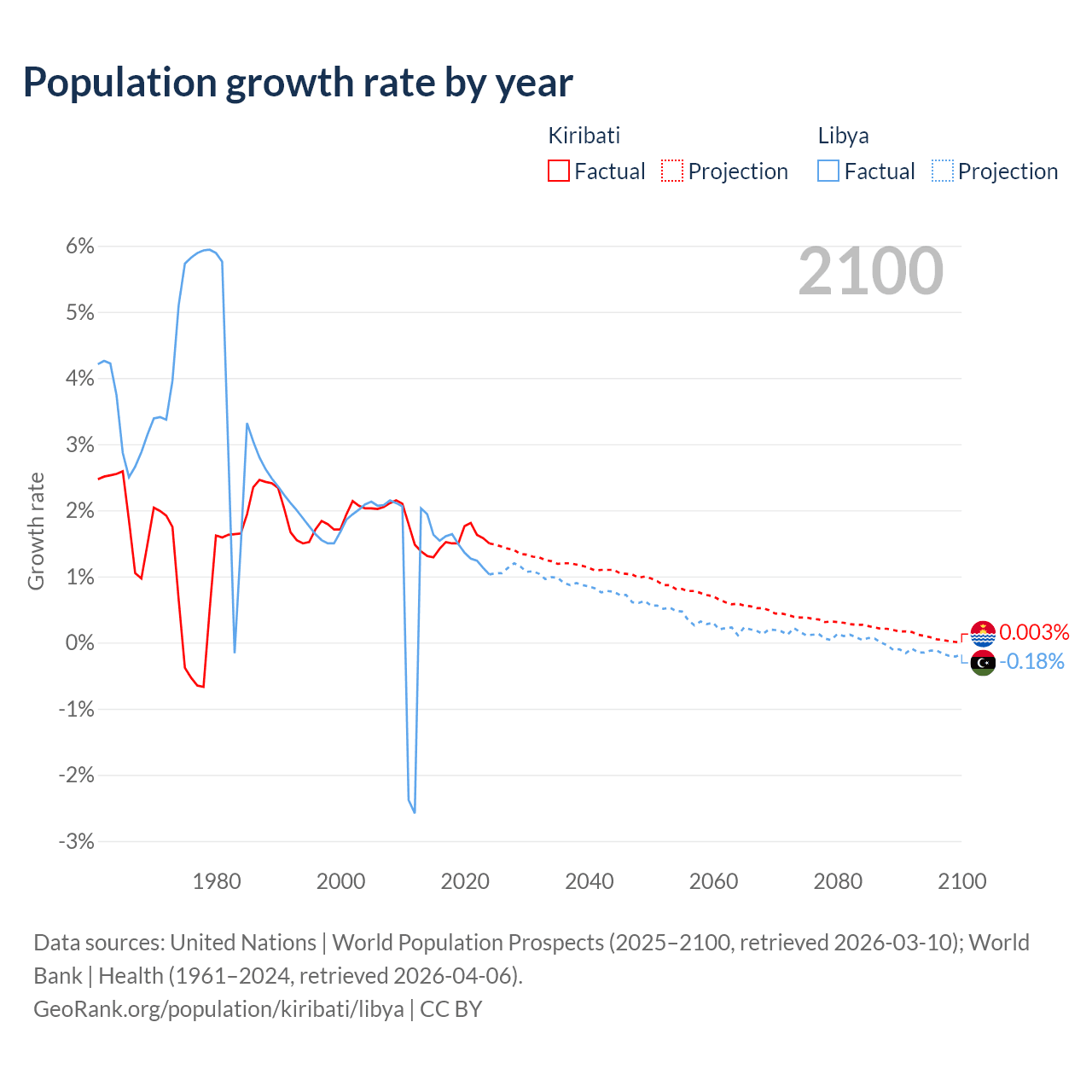 - For the last 10 years, Kiribati has had an average growth rate of +1.53% per year vs +1.44% in Libya.