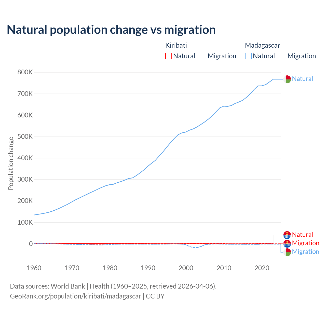 Over the last 10 years, 80% of the population change in Kiribati is from natural causes (a gain of 25,262 people) and 20% is from migration (a loss of 6,330 people). In Madagascar 99.7% is from natural causes (a gain of 7,165,578 people) and 0.31% is from migration (a loss of 22,384 people).