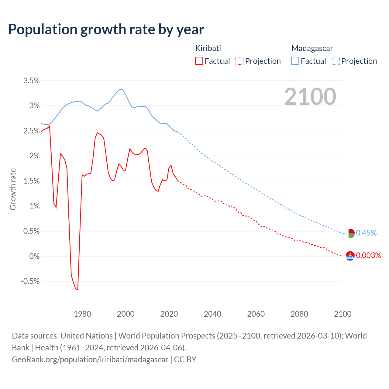 - For the last 10 years, Kiribati has had an average growth rate of +1.53% per year vs +2.6% in Madagascar.