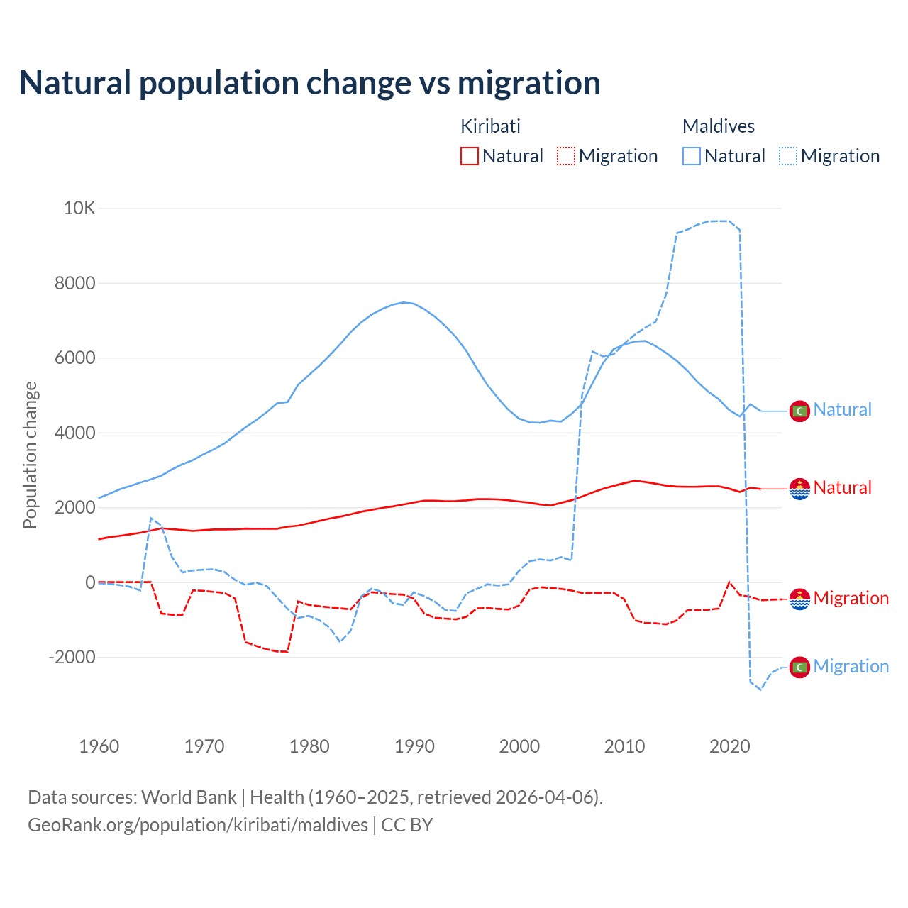 Over the last 10 years, 80% of the population change in Kiribati is from natural causes (a gain of 25,262 people) and 20% is from migration (a loss of 6,330 people). In Maldives 42.7% is from natural causes (a gain of 51,342 people) and 57.3% is from migration (a gain of 68,788 people).