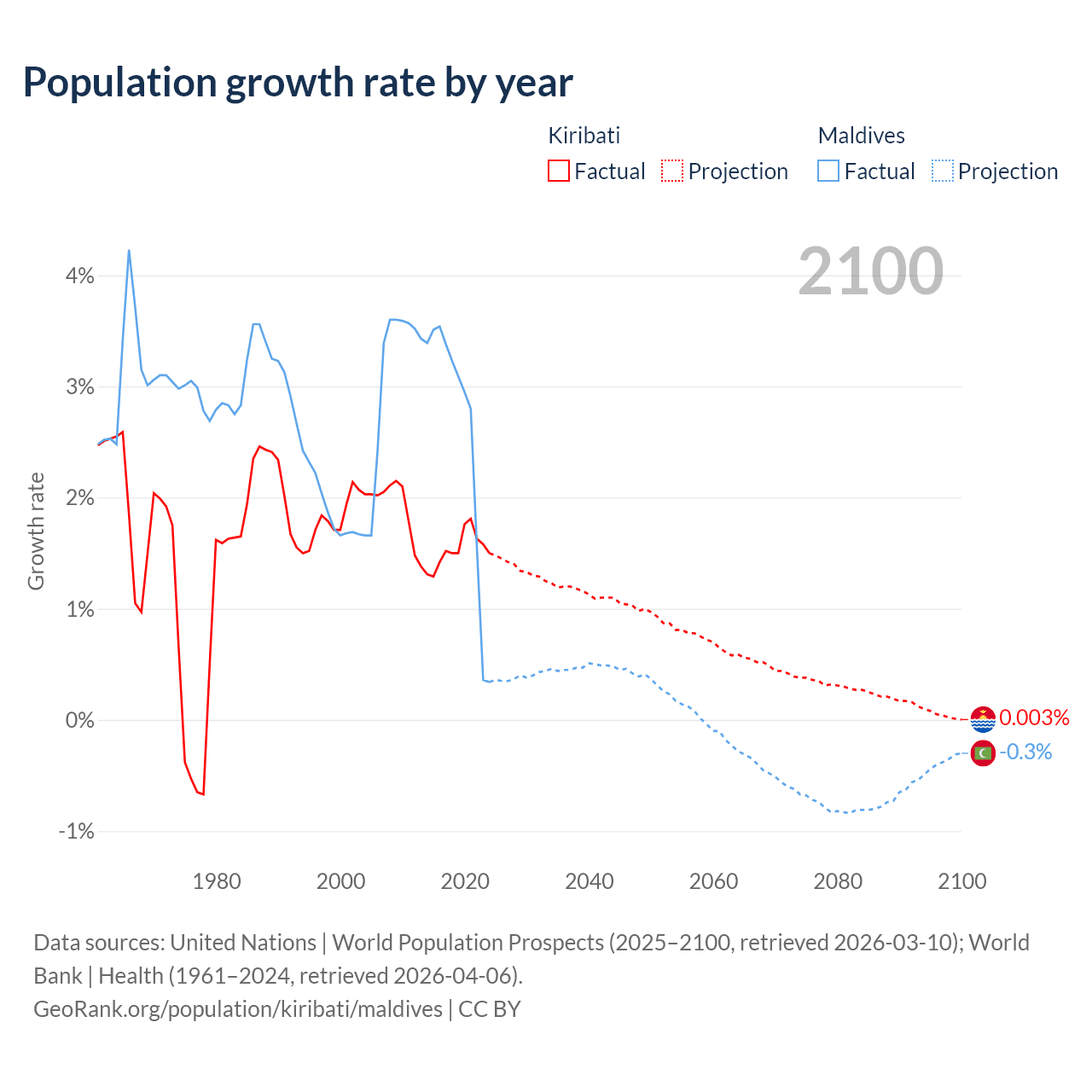 - For the last 10 years, Kiribati has had an average growth rate of +1.53% per year vs +2.56% in Maldives.