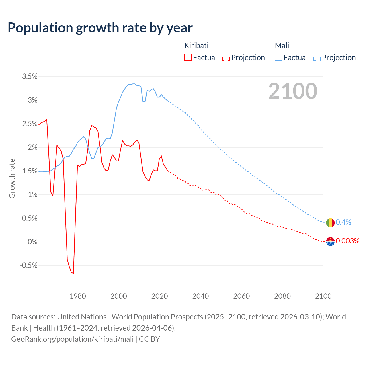 - For the last 10 years, Kiribati has had an average growth rate of +1.53% per year vs +3.12% in Mali.