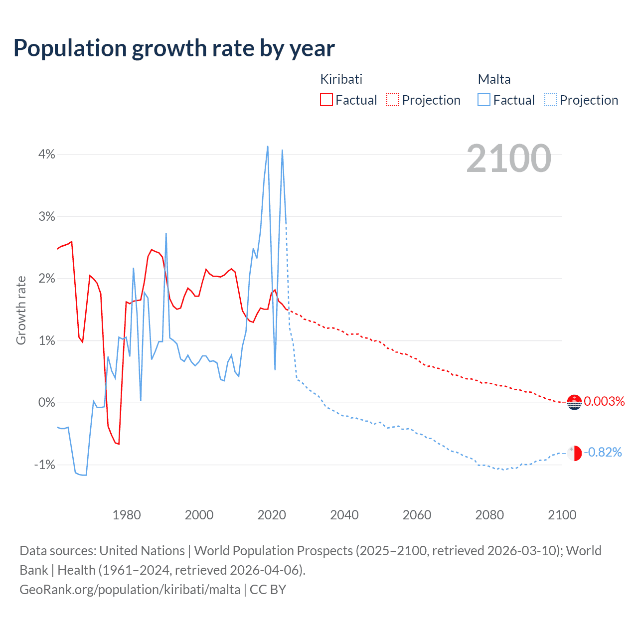 - For the last 10 years, Kiribati has had an average growth rate of +1.53% per year vs +2.69% in Malta.