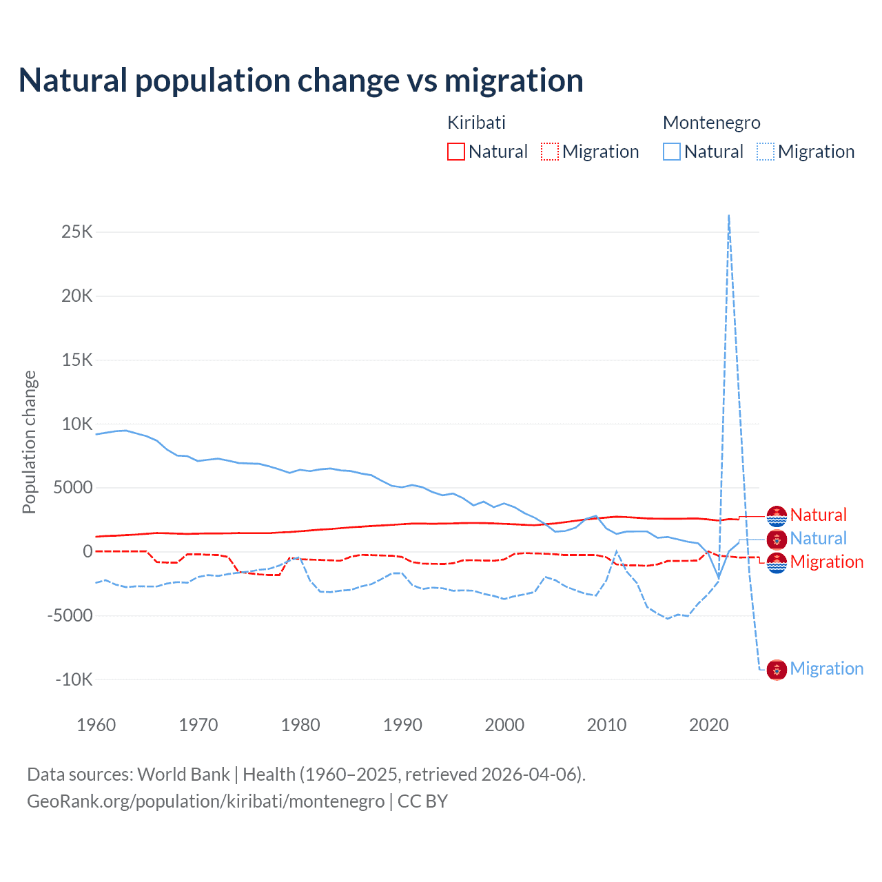 Over the last 10 years, 80% of the population change in Kiribati is from natural causes (a gain of 25,262 people) and 20% is from migration (a loss of 6,330 people). In Montenegro 52.4% is from natural causes (a gain of 4,501 people) and 47.6% is from migration (a gain of 4,095 people).