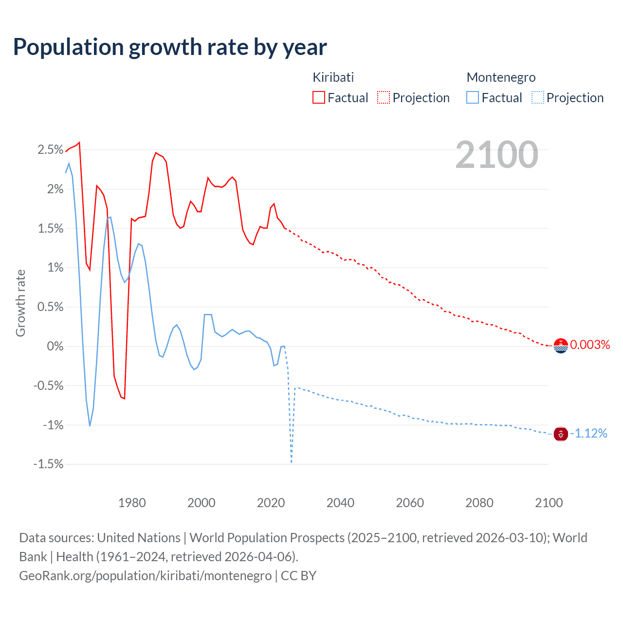 - For the last 10 years, Kiribati has had an average growth rate of +1.53% per year vs +0.01% in Montenegro.