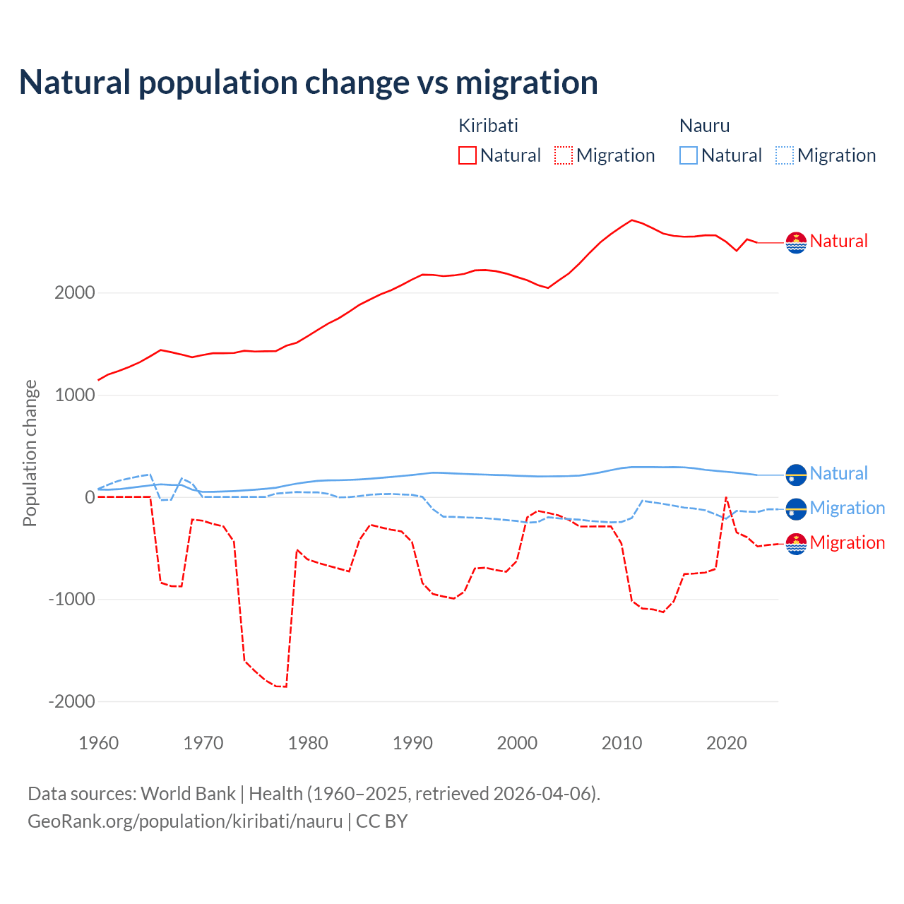 Over the last 10 years, 80% of the population change in Kiribati is from natural causes (a gain of 25,262 people) and 20% is from migration (a loss of 6,330 people). In Nauru 66.2% is from natural causes (a gain of 2,590 people) and 33.8% is from migration (a loss of 1,320 people).